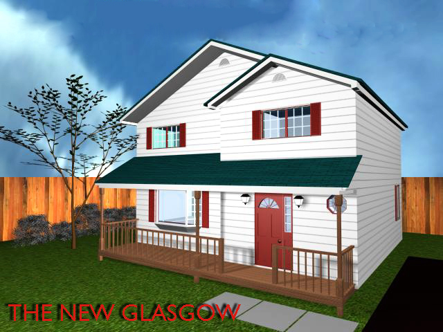 The New Glasgow This is a very Unique 1624 sq. ft. design with features found in Much larger homes. The kitchen, eating area and dining room feature is an interesting benefit. The upstairs features three bedrooms with the master bedroom offering lots of room. The large front and rear decks give families some breathing space.
